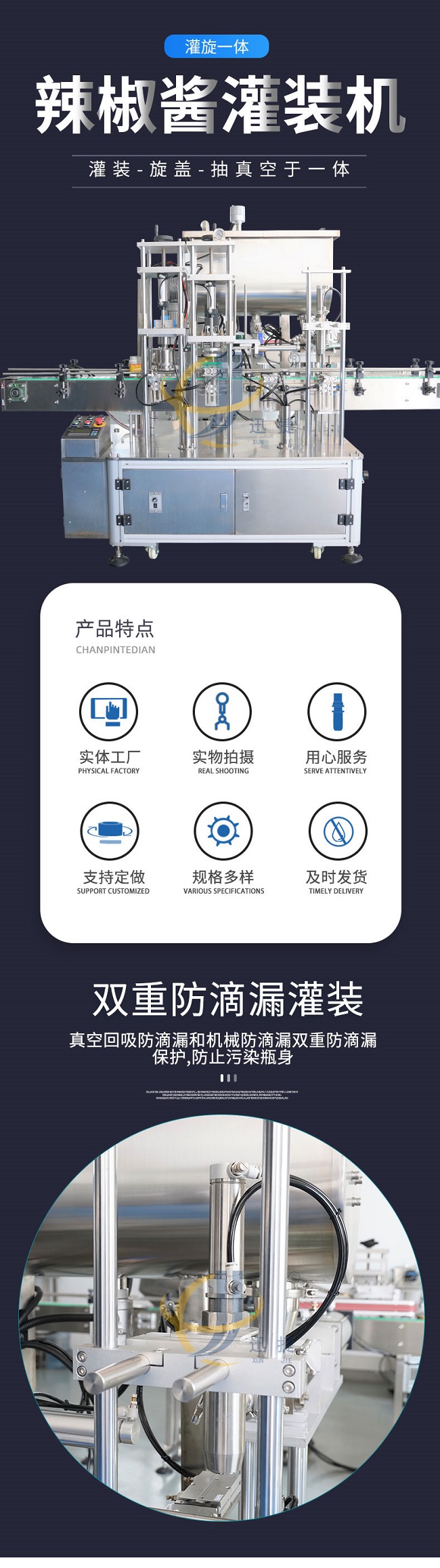 現在的生活節奏也比較快,牛肉醬也比較方便購買,網上、超市都有的售賣,所以許多的商家開始與全自動牛肉醬灌裝機廠家直銷進行合作,全自動牛肉醬灌裝機您知道如何選購嗎?這時候在灌裝顆粒比較大或者比較粘稠或比較干的醬料的時候,我們全自動牛肉醬灌裝機采用柱塞式進行計量,保證定量準確可靠,可用于多種瓶型,換瓶型只需要更換一套模具,模具更換的時間約為15分鐘左右,為了迎合社會發展的主題,全自動牛肉醬灌裝機效率高,幫助了很多企業解決了人工難題也更受消費者歡迎。